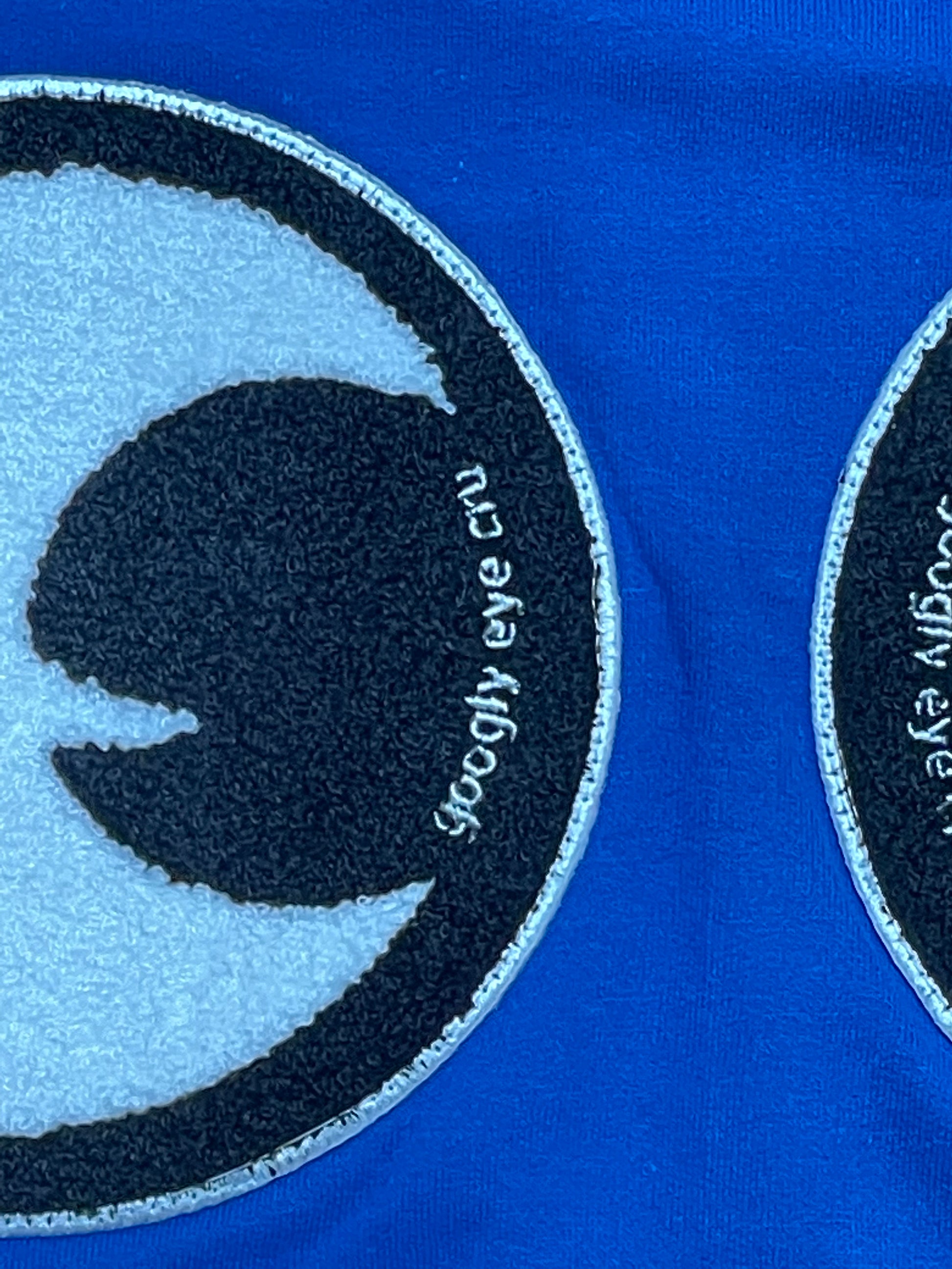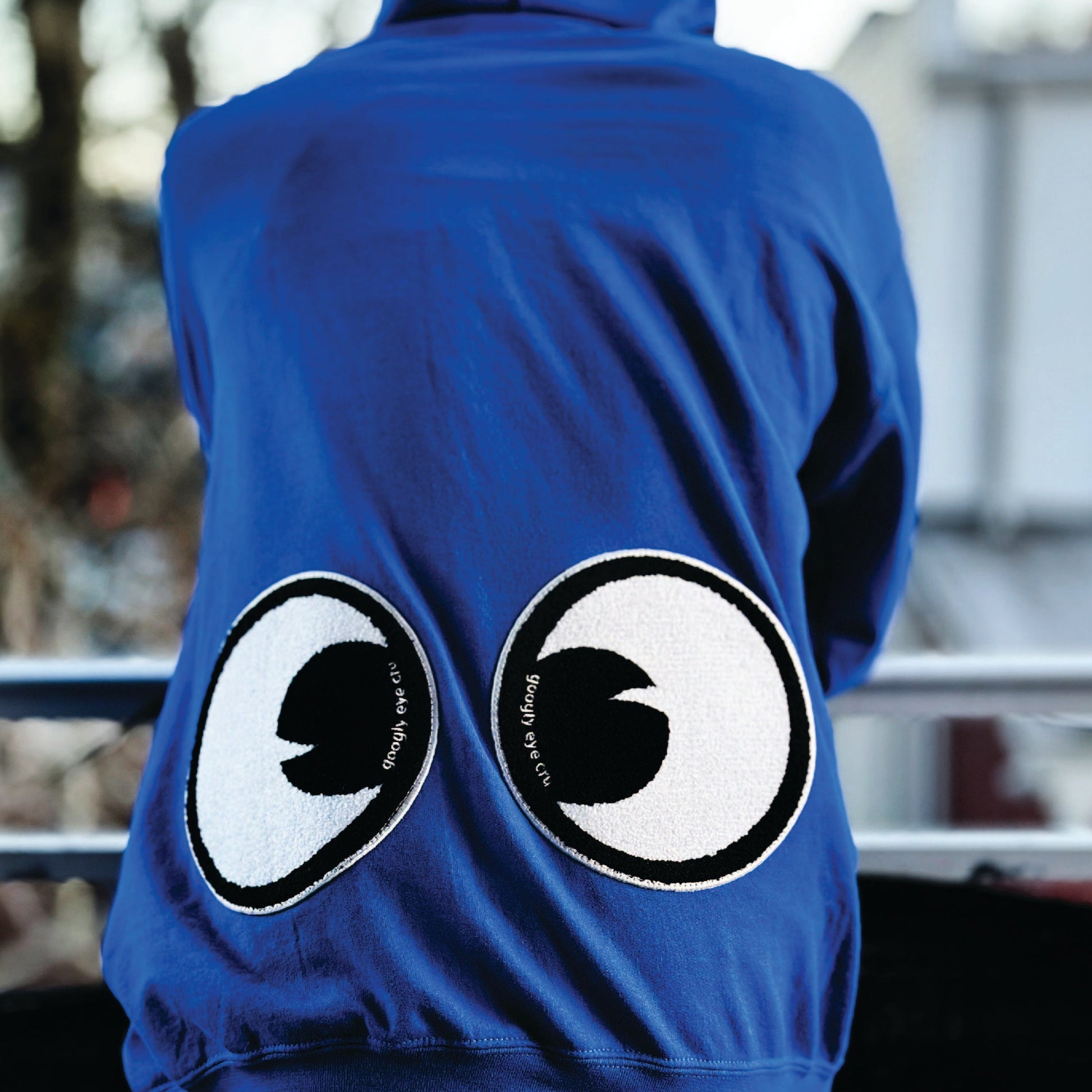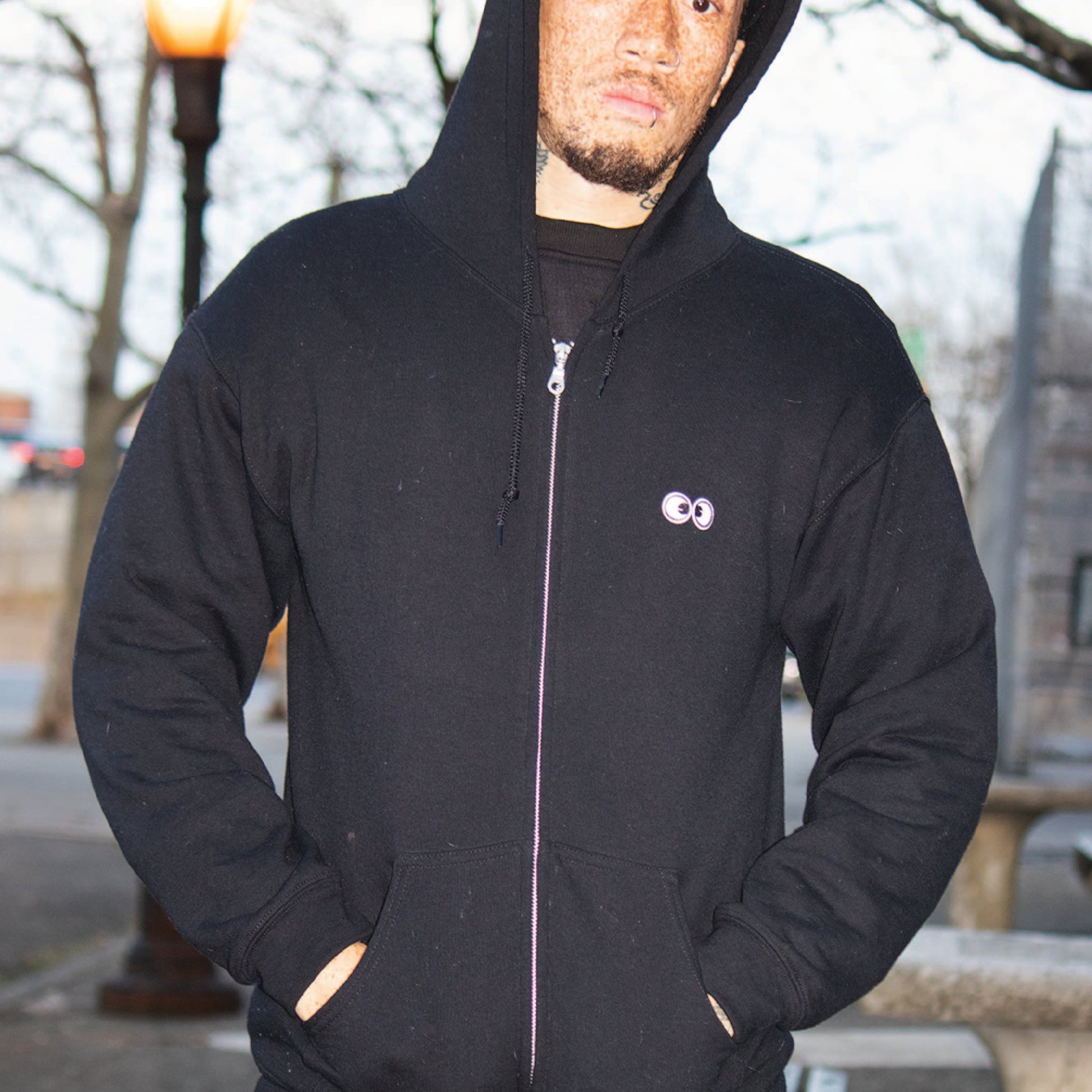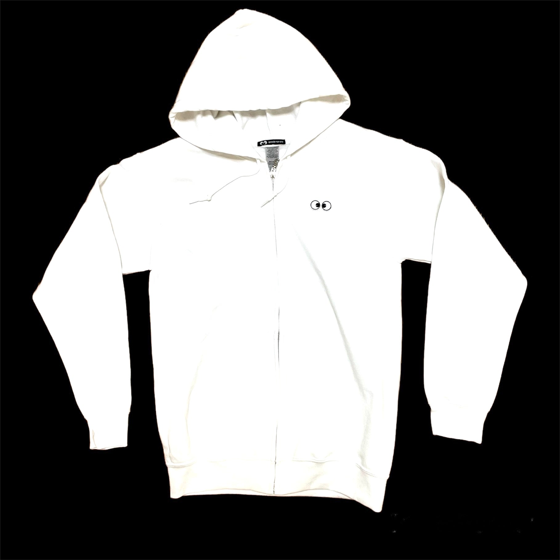 50/50 Polyester/ Cotton 8oz fleece full zip hood with googly eye embroidered transfer patches at chest and HUGE chenille eye patches at the back. The size is unisex so everyone can look googly!