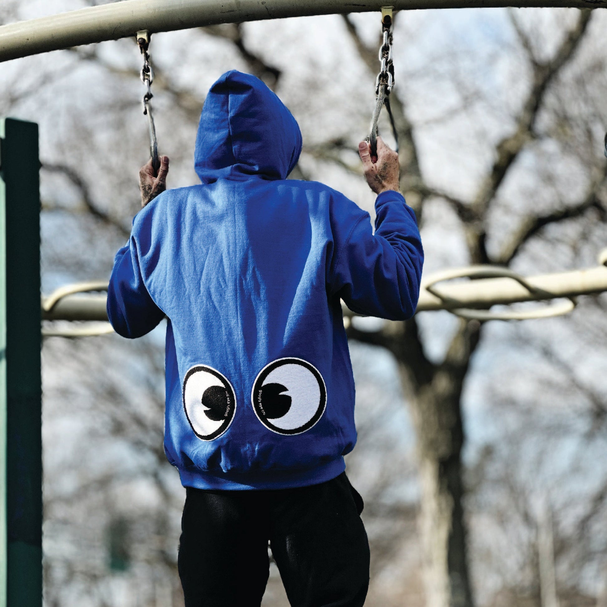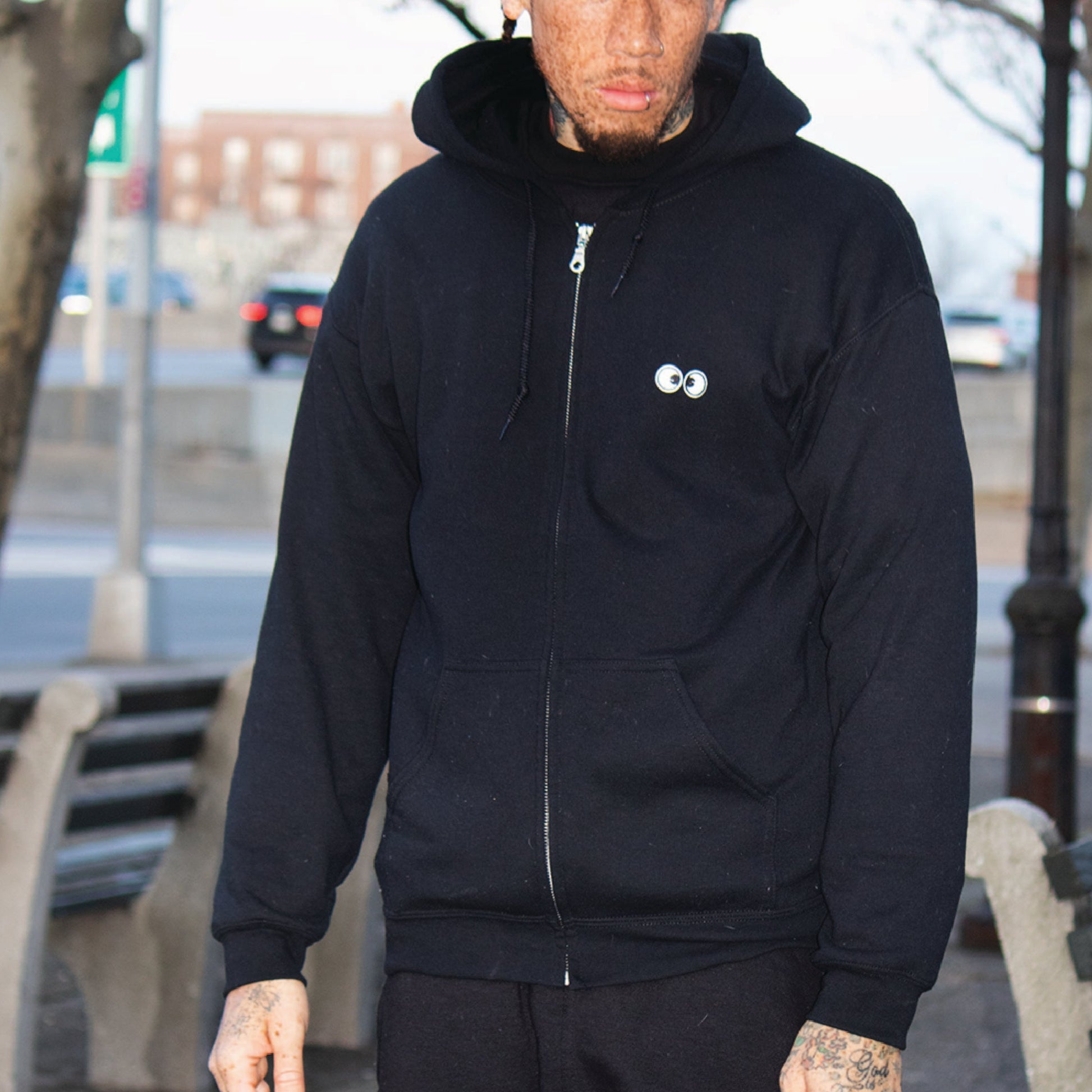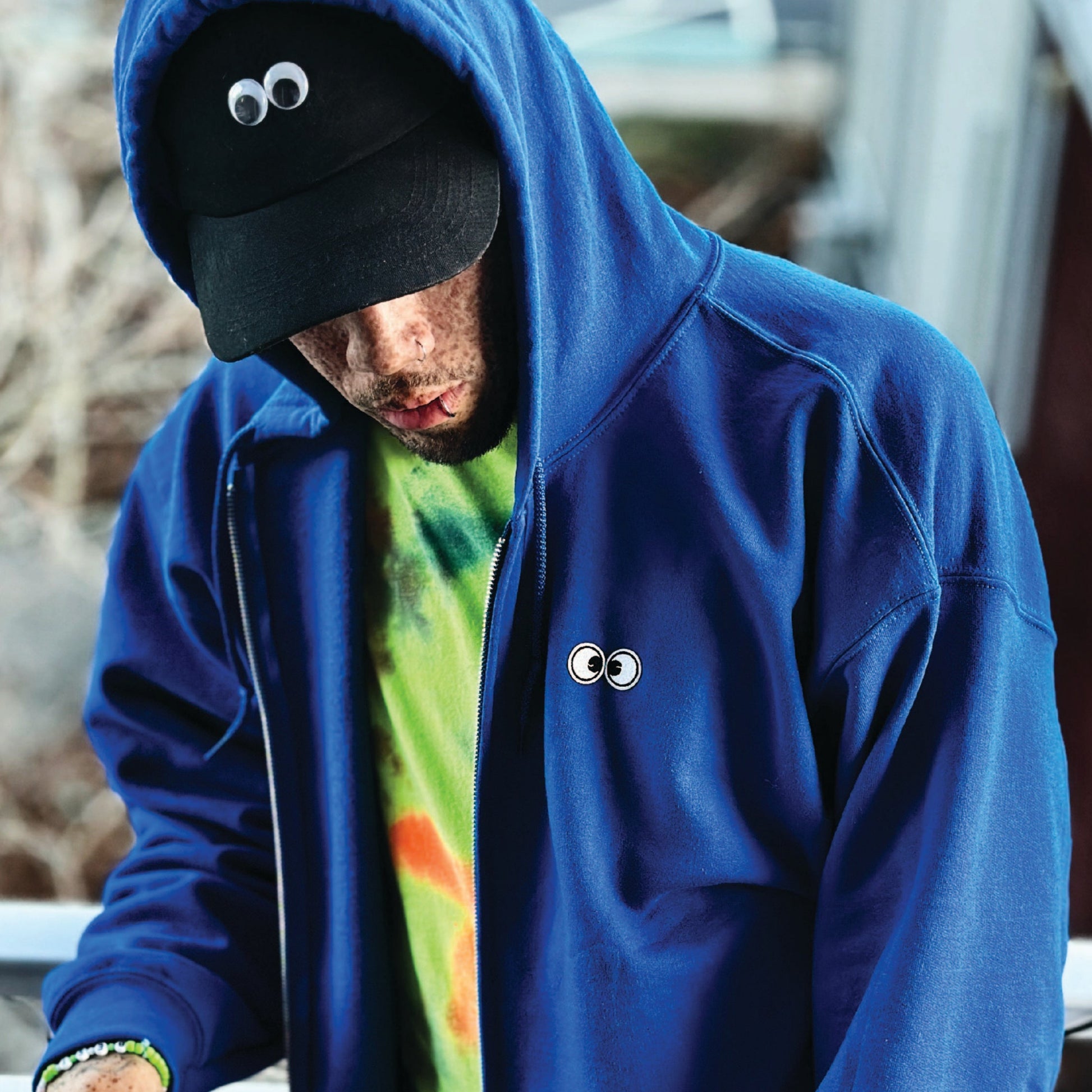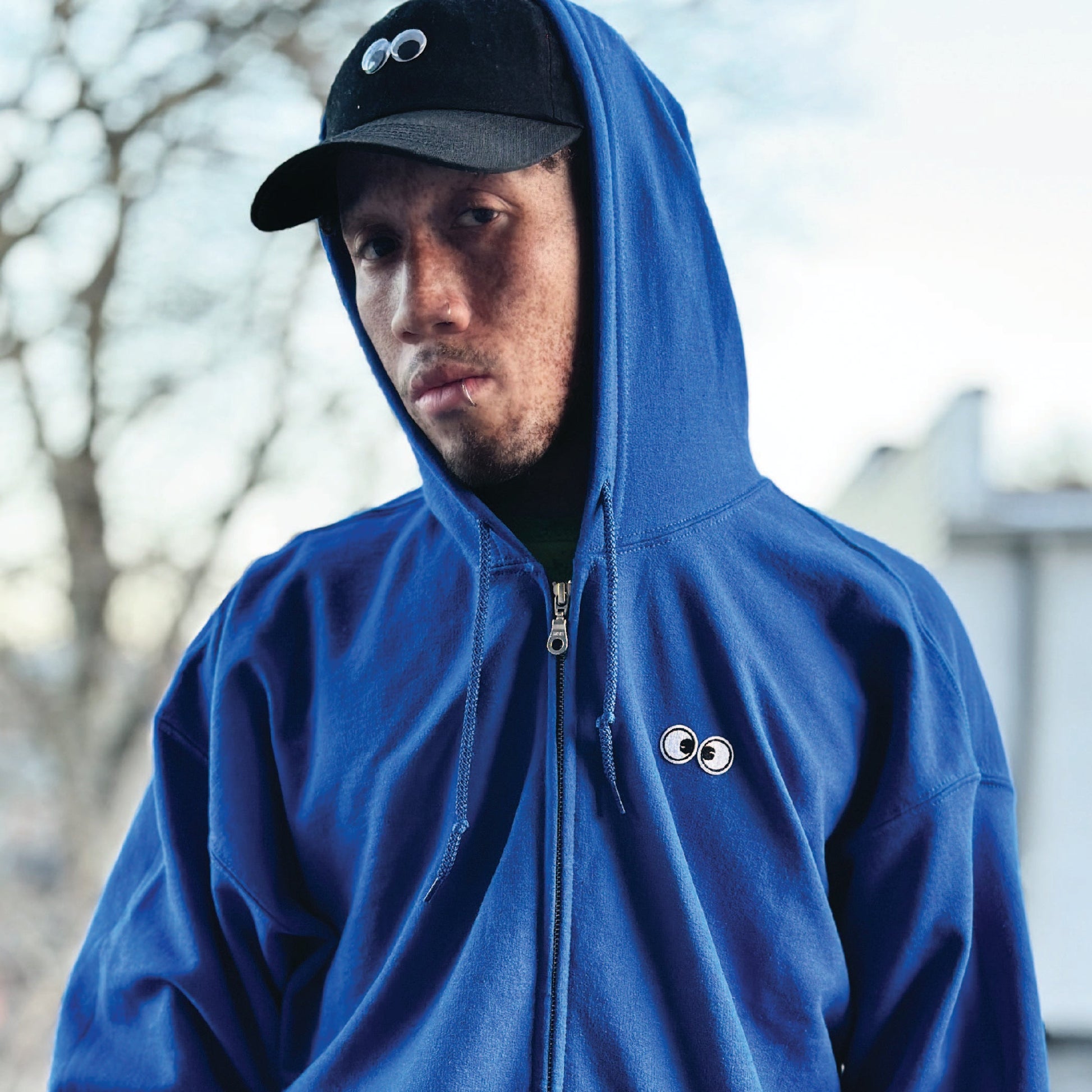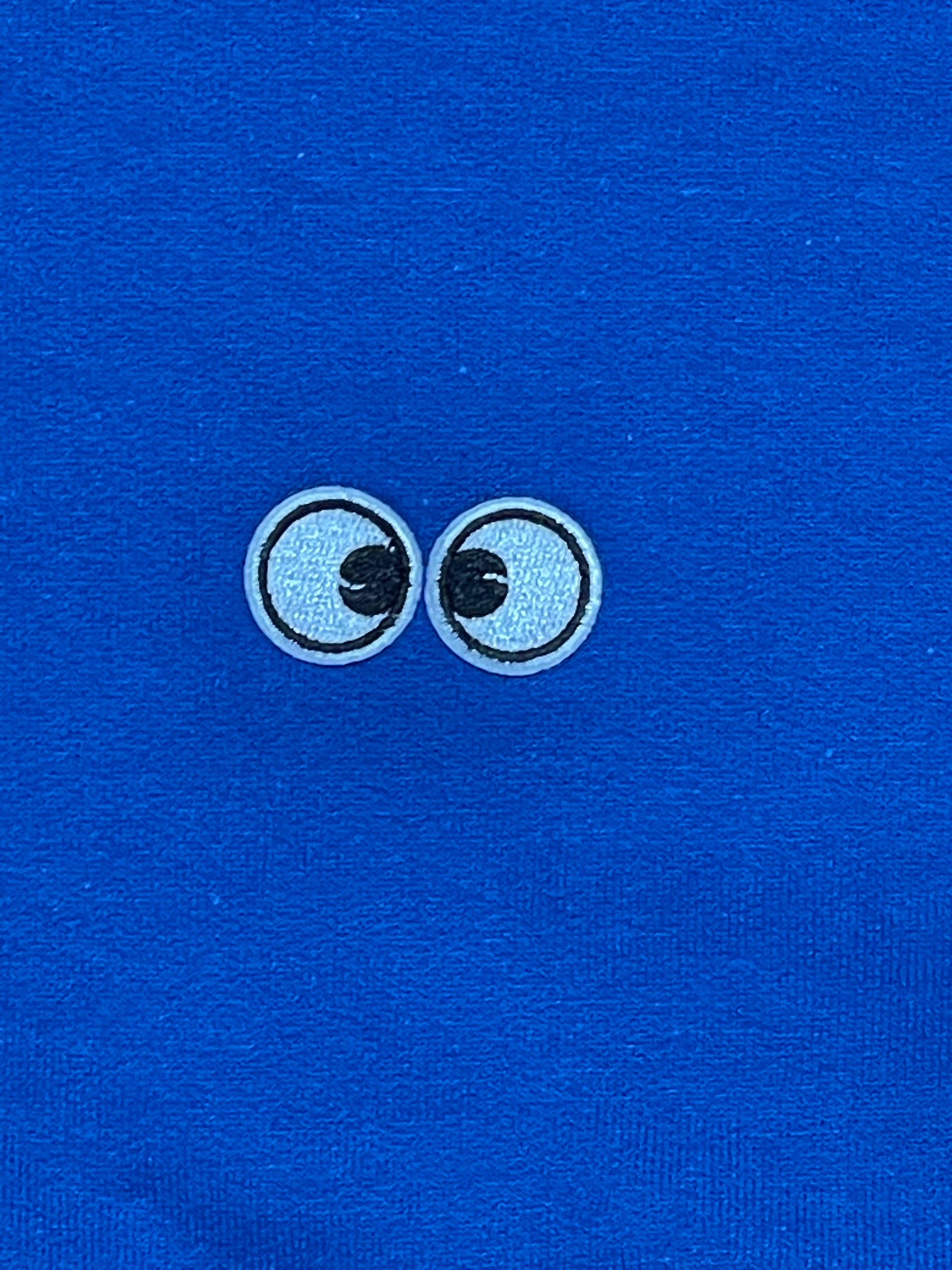 50/50 Polyester/ Cotton 8oz fleece full zip hood with googly eye embroidered transfer patches at chest and HUGE chenille eye patches at the back. The size is unisex so everyone can look googly!