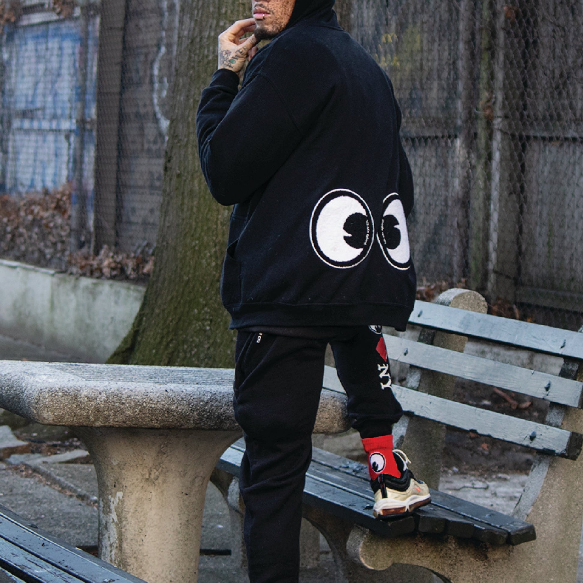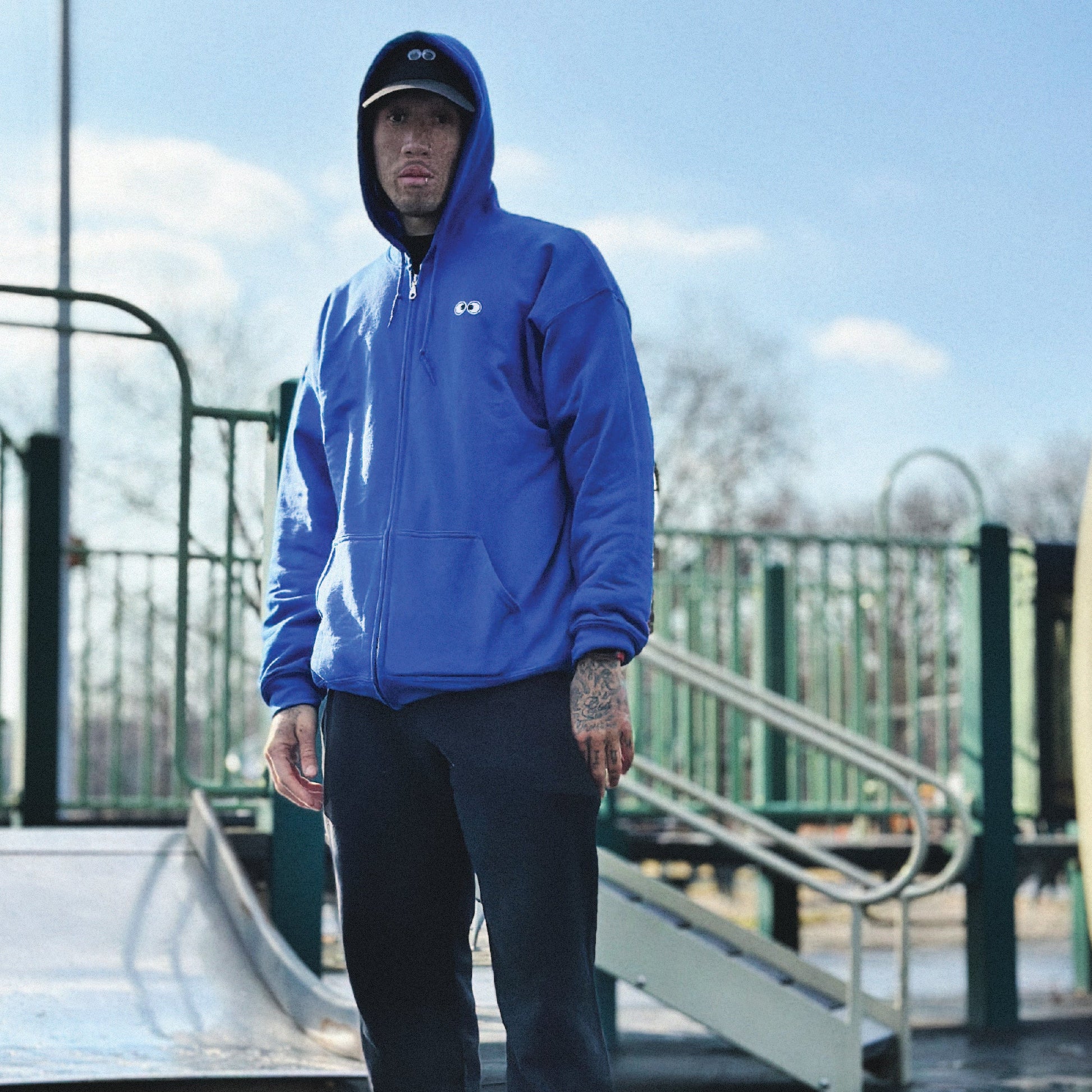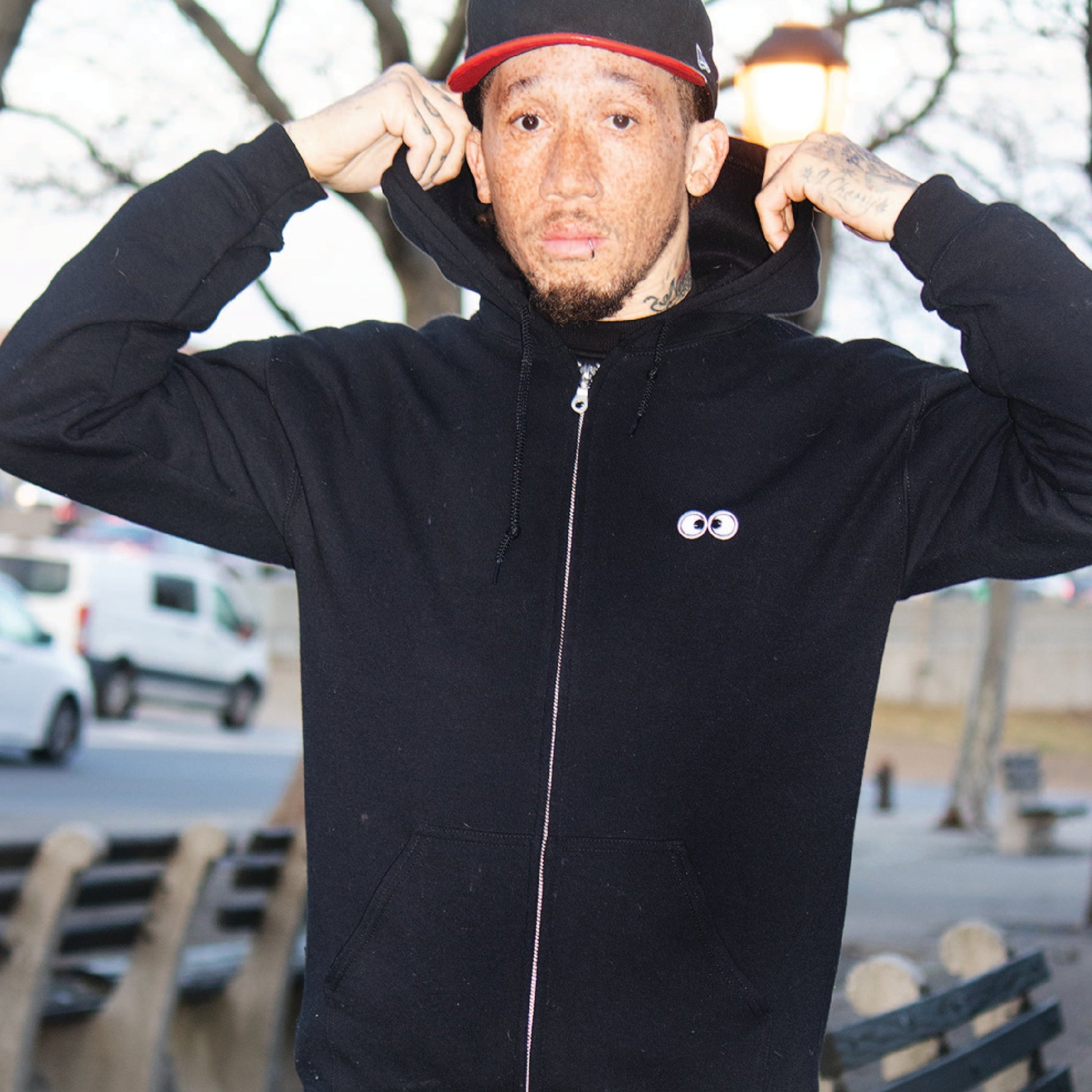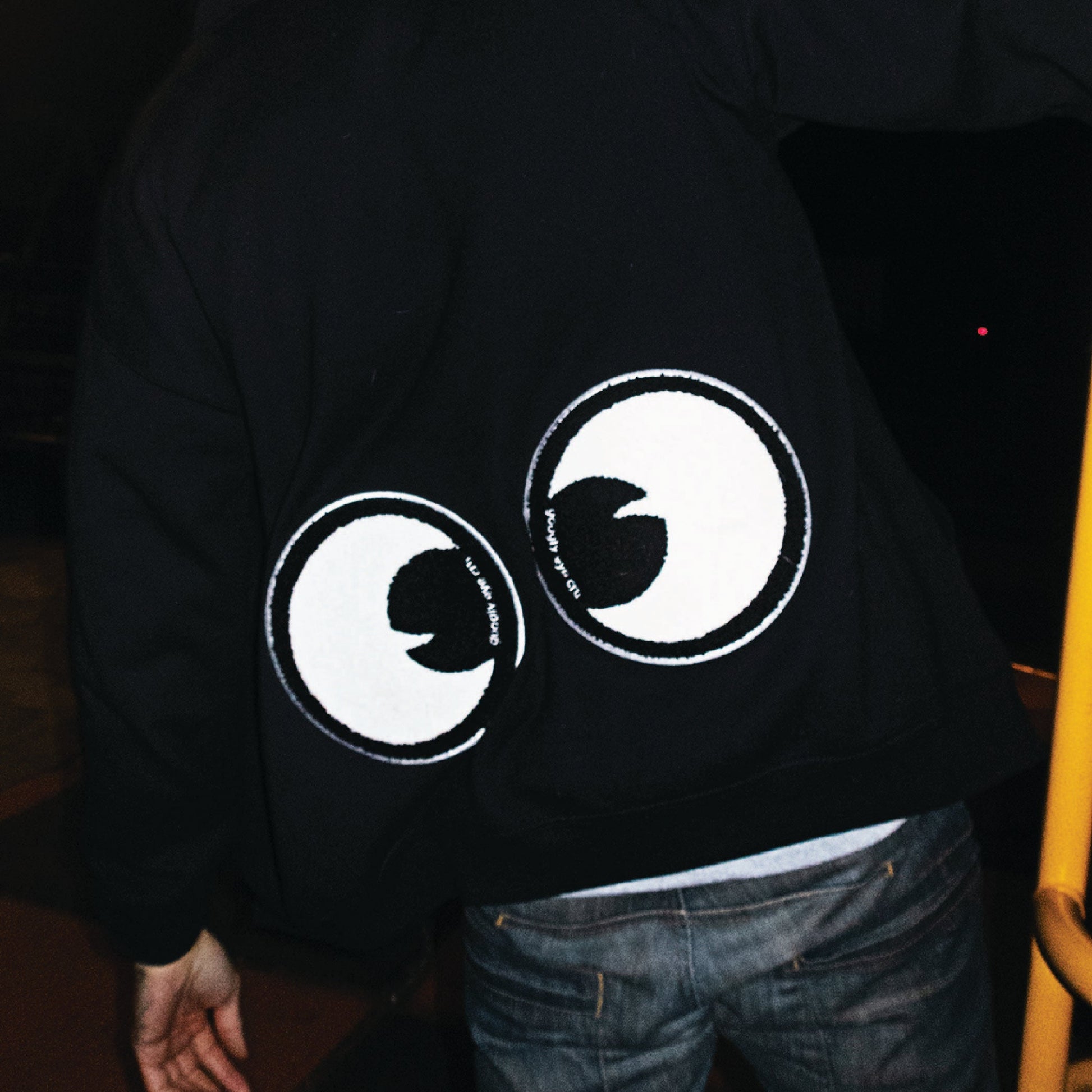 50/50 Polyester/ Cotton 8oz fleece full zip hood with googly eye embroidered transfer patches at chest and HUGE chenille eye patches at the back. The size is unisex so everyone can look googly!